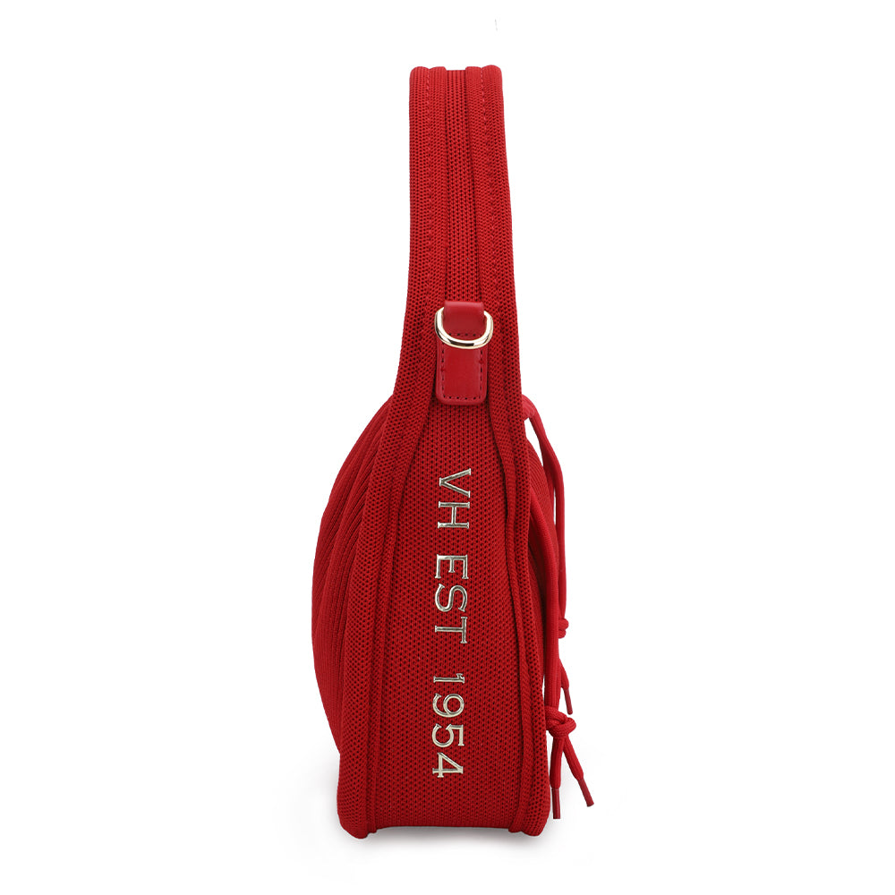 The Aurora Bag in red combines a stylish ribbed texture with a practical drawstring closure, offering both visual appeal and secure storage. Its design ensures easy access while keeping your essentials safe, making it a versatile accessory for everyday use.