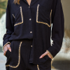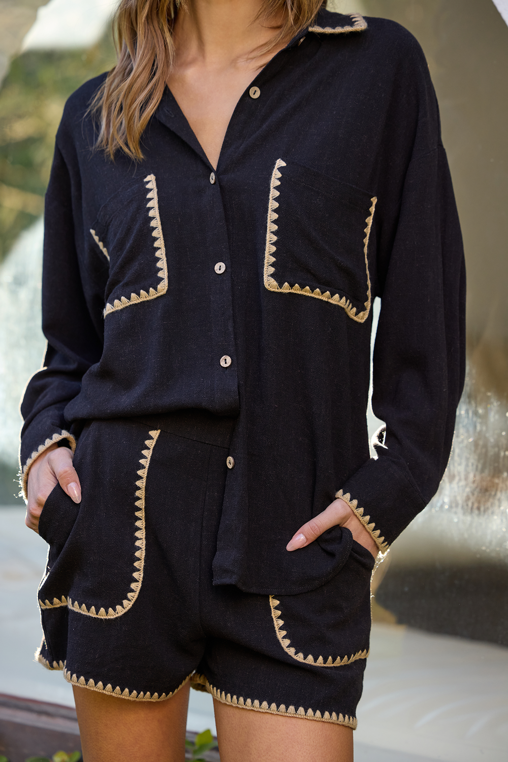 This Black Button Up Shirt with Tan Whip Stitch combines classic button-up design with subtle stitch detailing for a refined yet relaxed look. The tan whip stitch adds a distinctive touch, enhancing the shirt’s style without overpowering it. Perfect for both professional settings and casual outings, it offers versatility and understated sophistication.