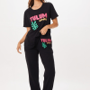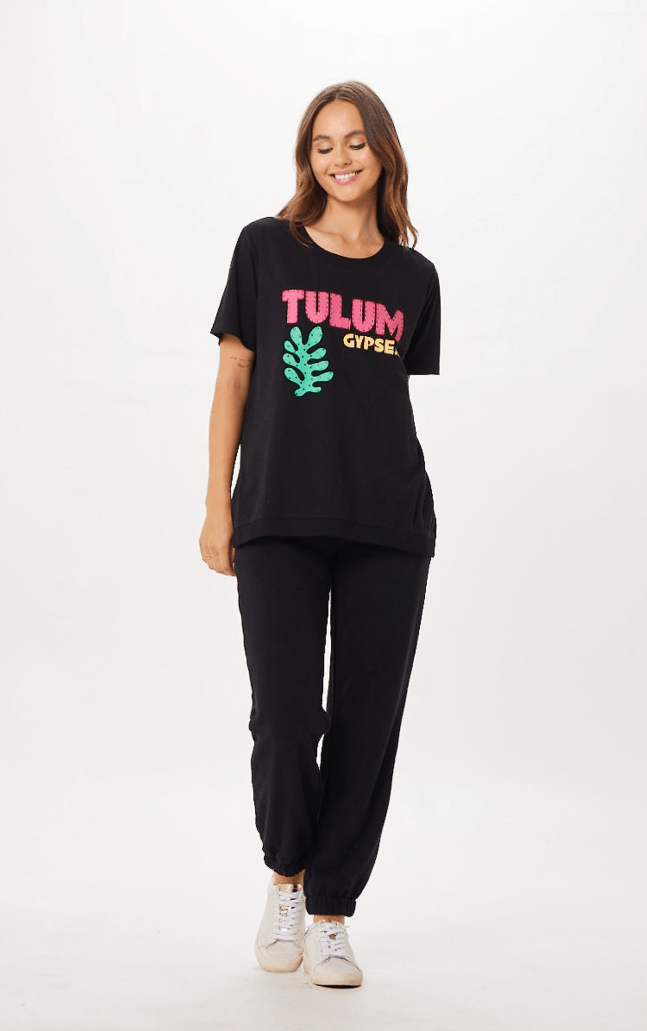 The Black Tulum Jet Setter Surf Wash Jogger combines comfort and style with its elastic waistband for a perfect fit and easy wear. Featuring a distinctive “Tulum” graphic and subtle gem details, this jogger adds a refined touch to your casual wardrobe. Ideal for those who appreciate relaxed yet polished apparel.