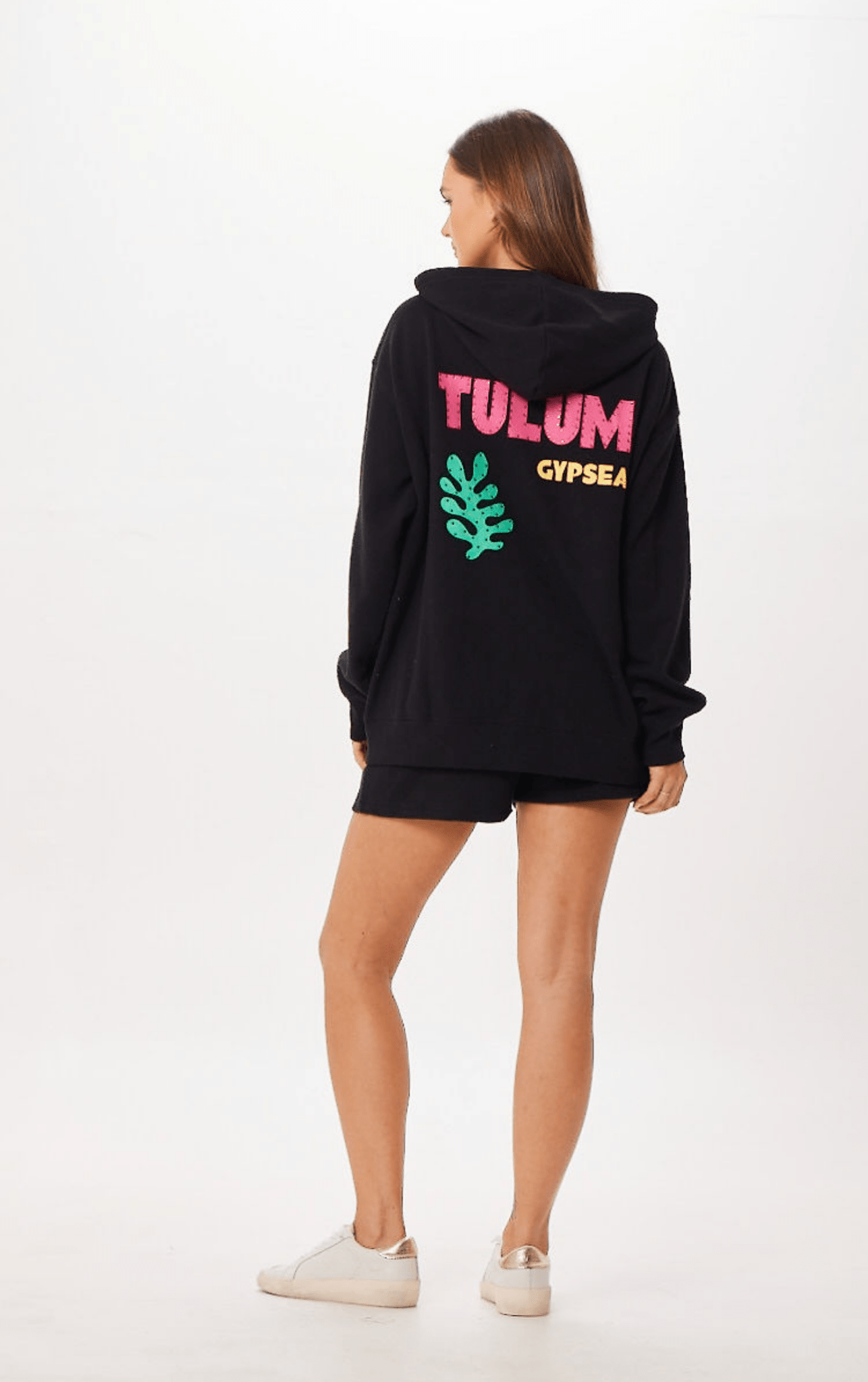 The Black Tulum Jet Setter Surf Wash Zip Up combines casual comfort with stylish details. This zip-up sweatshirt features a distinctive “Tulum” graphic and subtle gem accents, adding a refined touch to your everyday look. Perfect for layering, it offers both warmth and a sleek, modern vibe for your active lifestyle.
