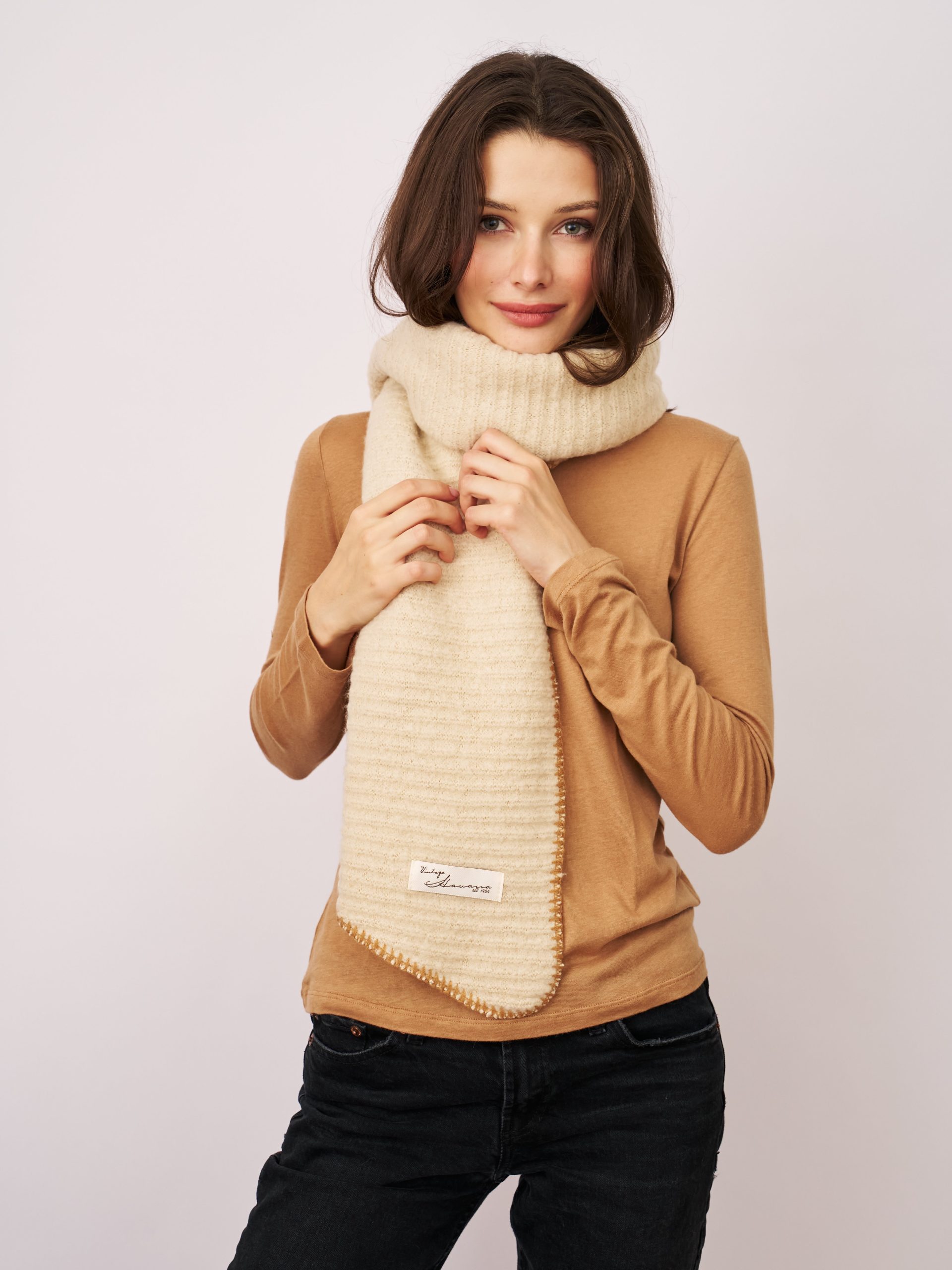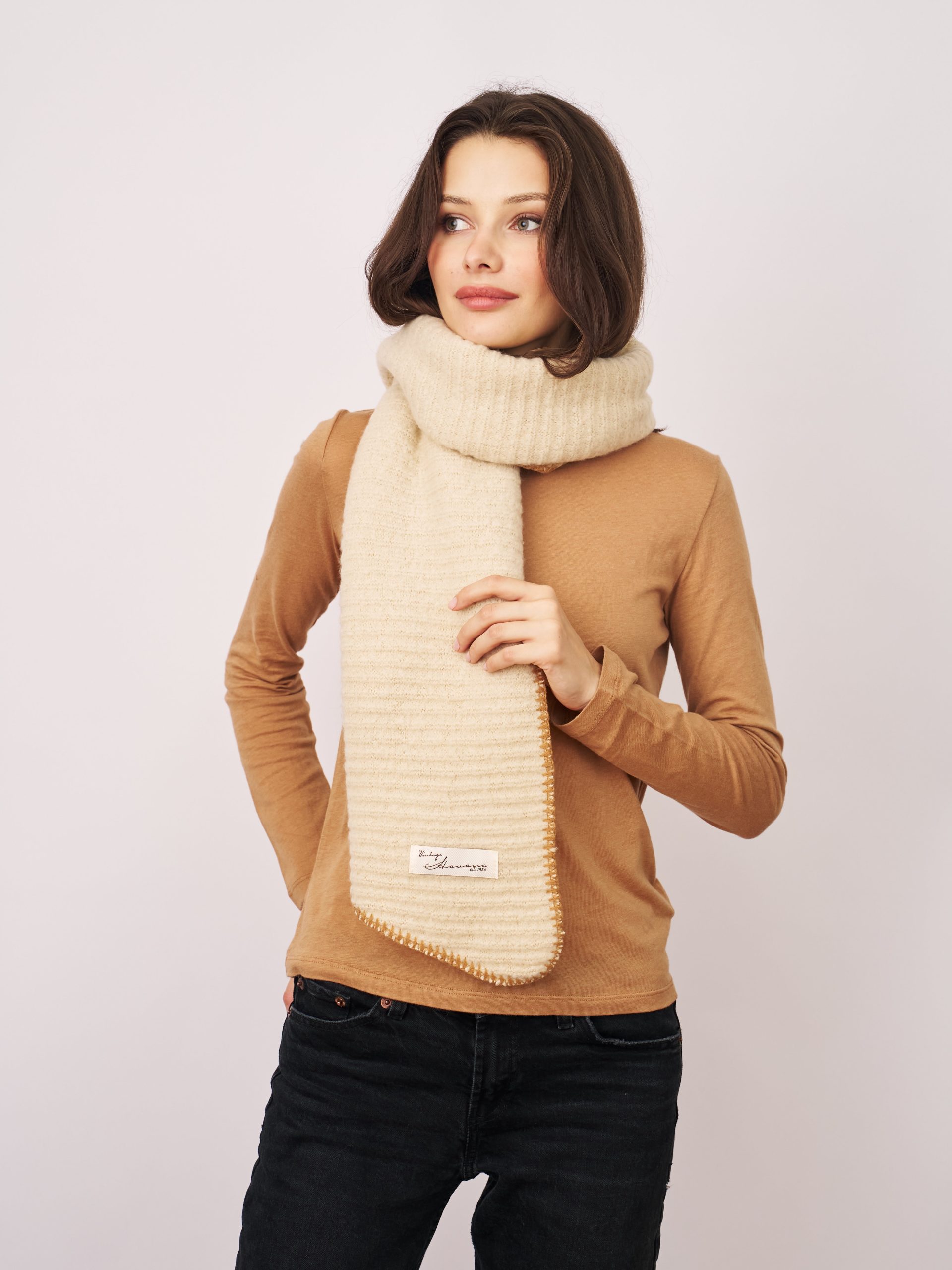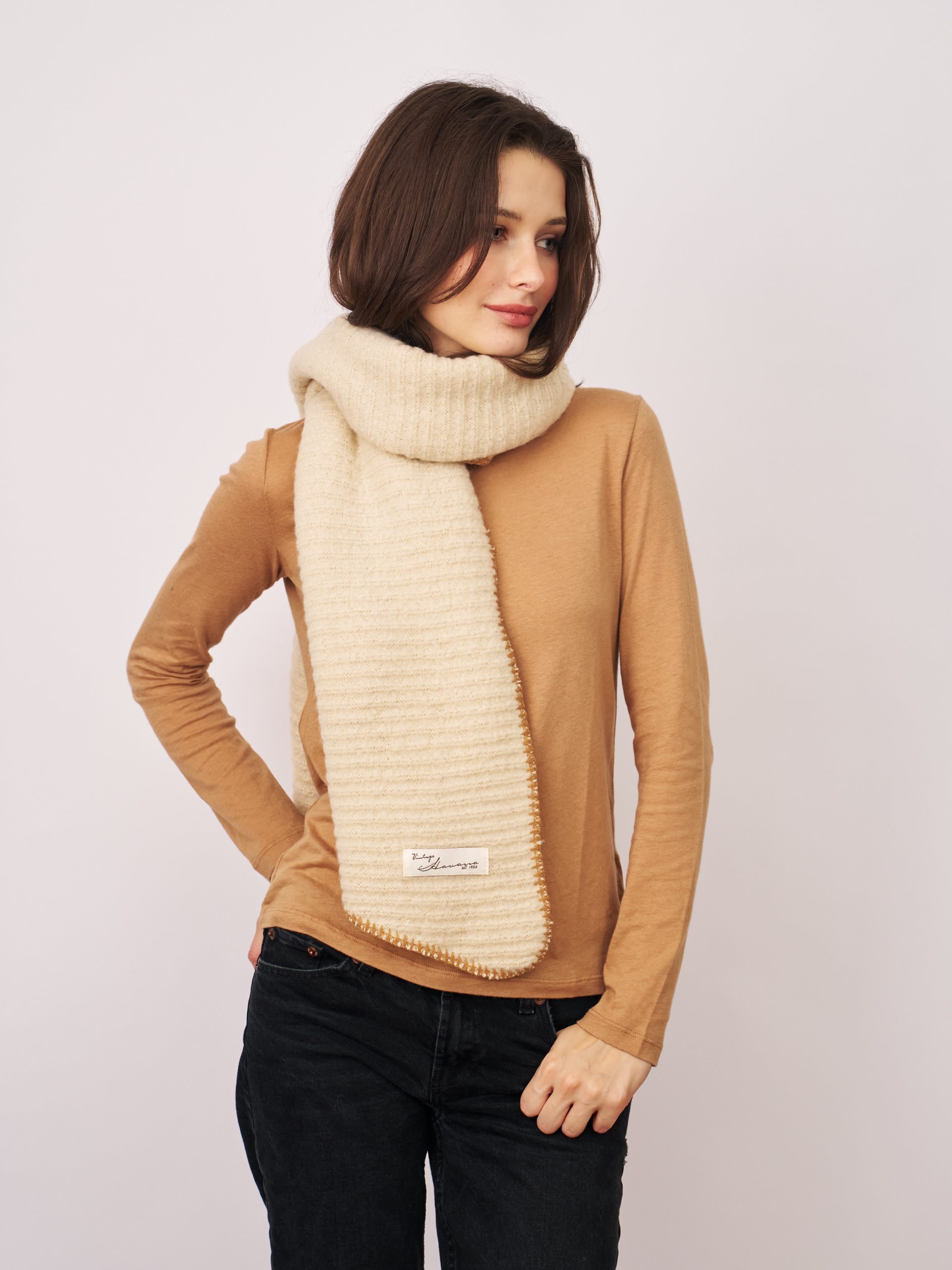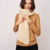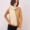This Blanket Stitch Knit Scarf in Ivory/Wheat features a stylish whipstitch trim and is crafted from 100% recycled polyester. Soft and eco-friendly, it offers warmth and comfort while supporting sustainable fashion choices. Perfect for adding a subtle, sophisticated touch to your everyday look.