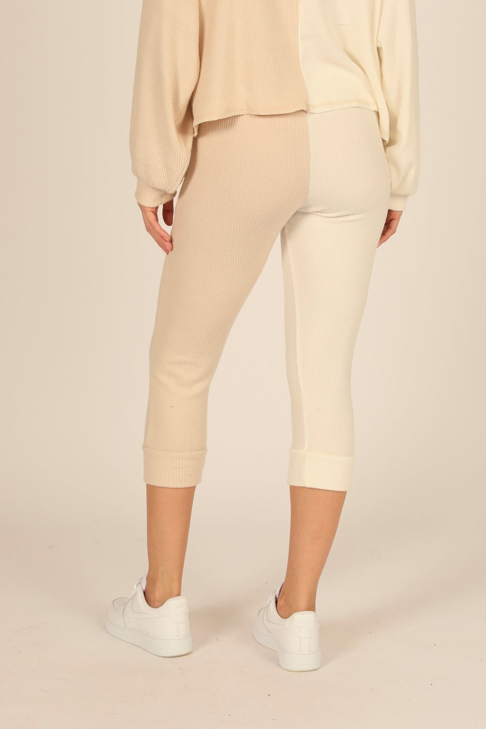 The Brushed Hacci Rib Split Jogger offers a comfortable, cropped fit perfect for warmer days. Crafted from a soft blend of rayon, polyester, and spandex, it provides gentle stretch and breathability. Available in a subtle Summer White and Light Taupe, this jogger combines style with ease of care—simply hand wash cold and dry flat to maintain its quality. Ideal for casual wear with a refined touch.