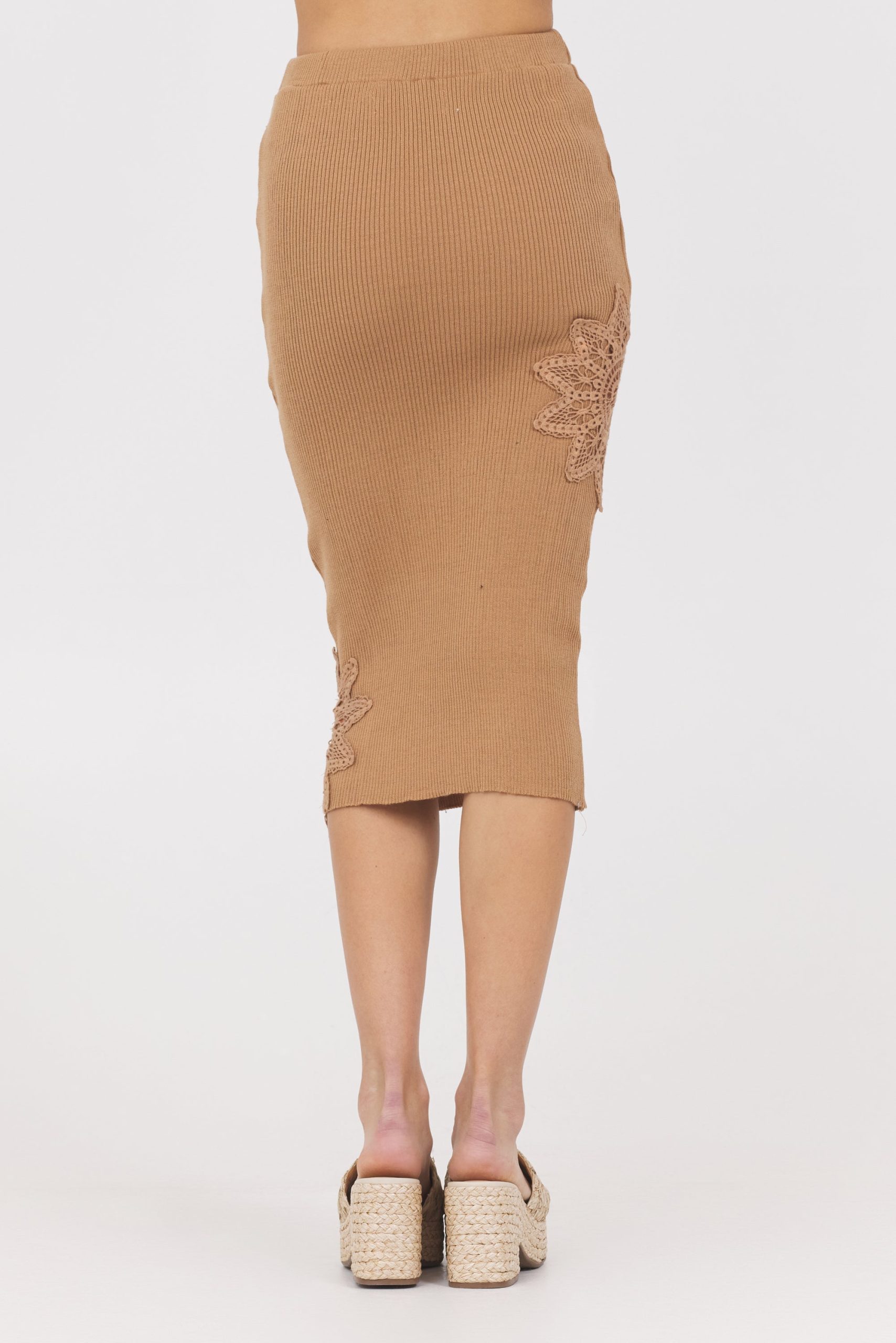 This Caramel Rib Midi Skirt features a comfortable elastic waistband and a stylish crochet insert that adds subtle cutout detail. Its midi length offers a versatile silhouette perfect for both casual and polished looks. Crafted for ease and elegance, it pairs effortlessly with a variety of tops and shoes.