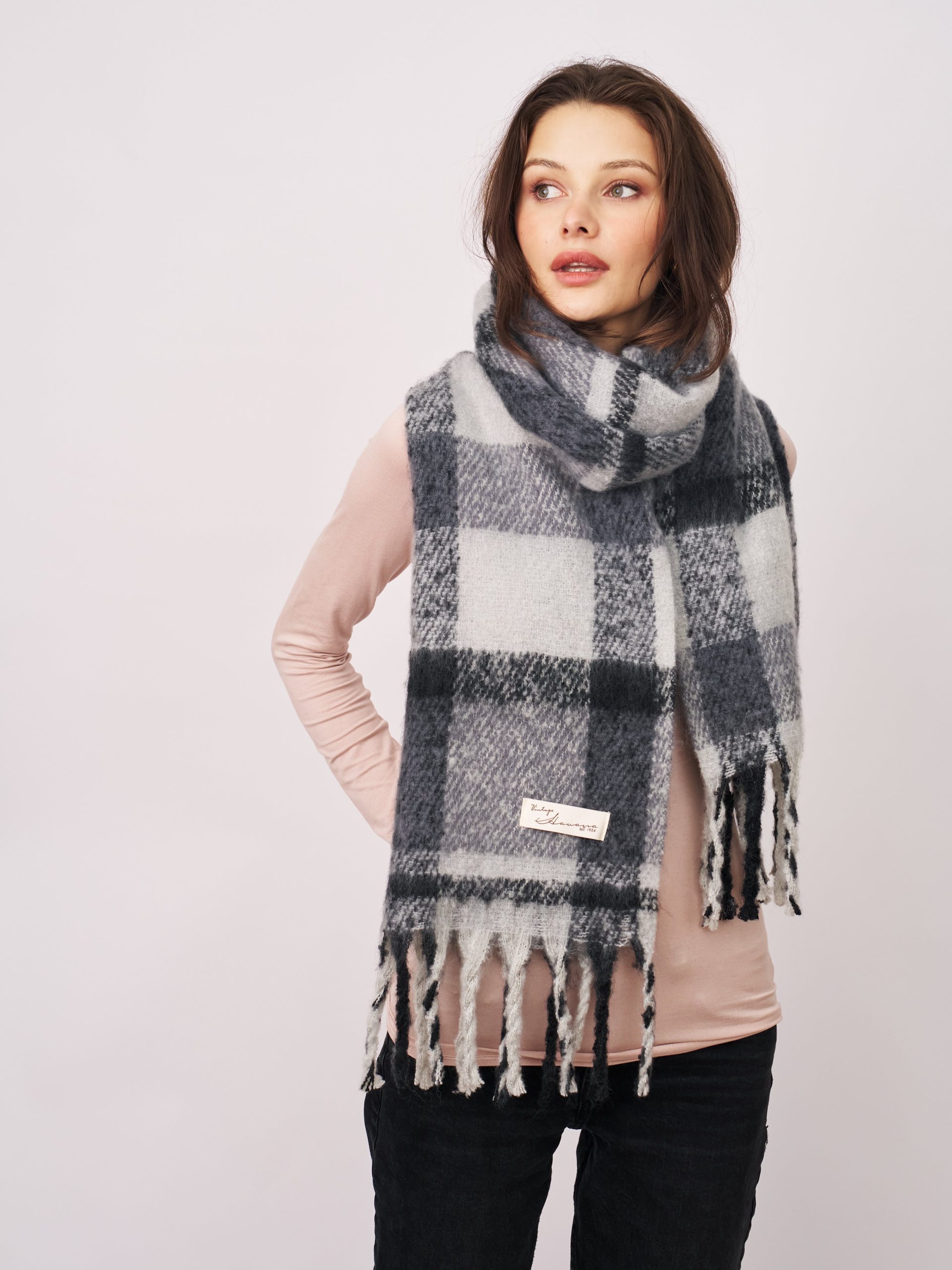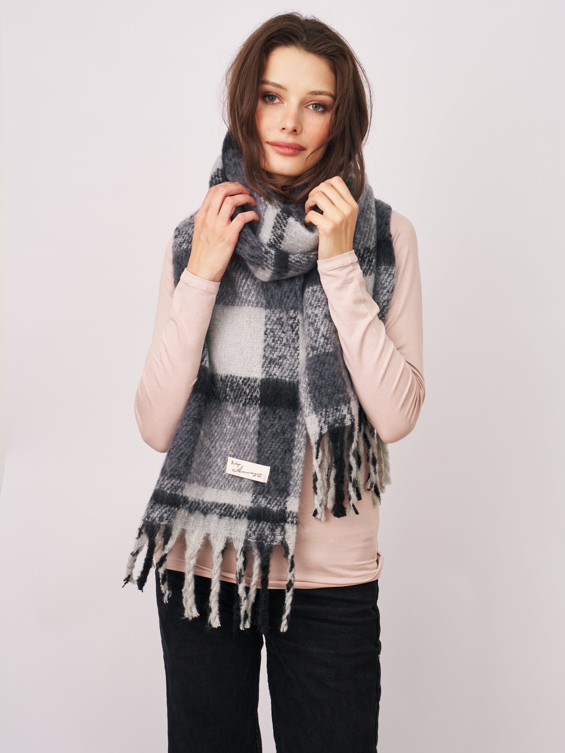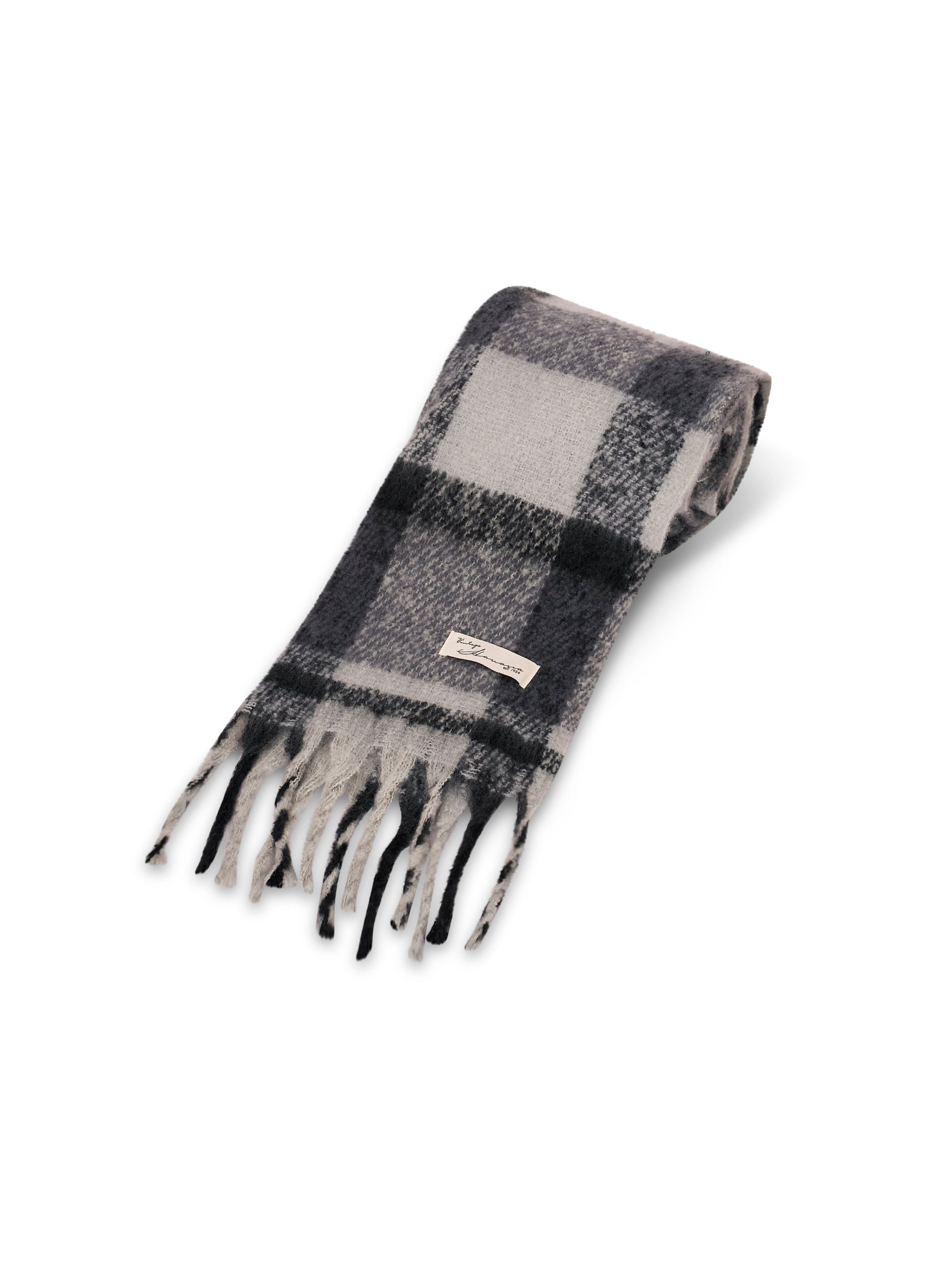 - Bold check brushed fringe scarf