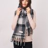 This check brush tassel scarf in black combines classic pattern with soft, brushed polyester fabric for comfortable warmth. Its lightweight design and stylish fringe detail make it a versatile accessory that effortlessly elevates any outfit. Perfect for adding a subtle touch of sophistication to your everyday look.