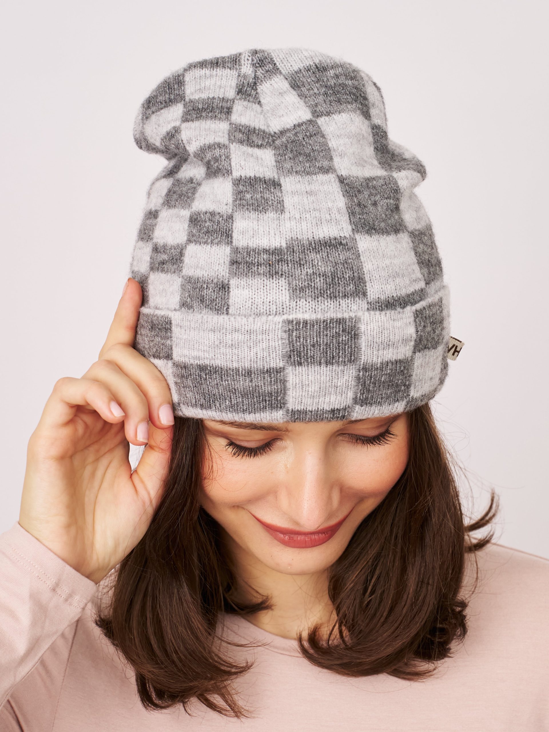 Stay warm and stylish with this grey check pattern beanie. Crafted for comfort and a snug fit, its classic checkerboard design adds a subtle yet distinctive touch to any casual outfit. Perfect for chilly days, this beanie combines practicality with timeless style.