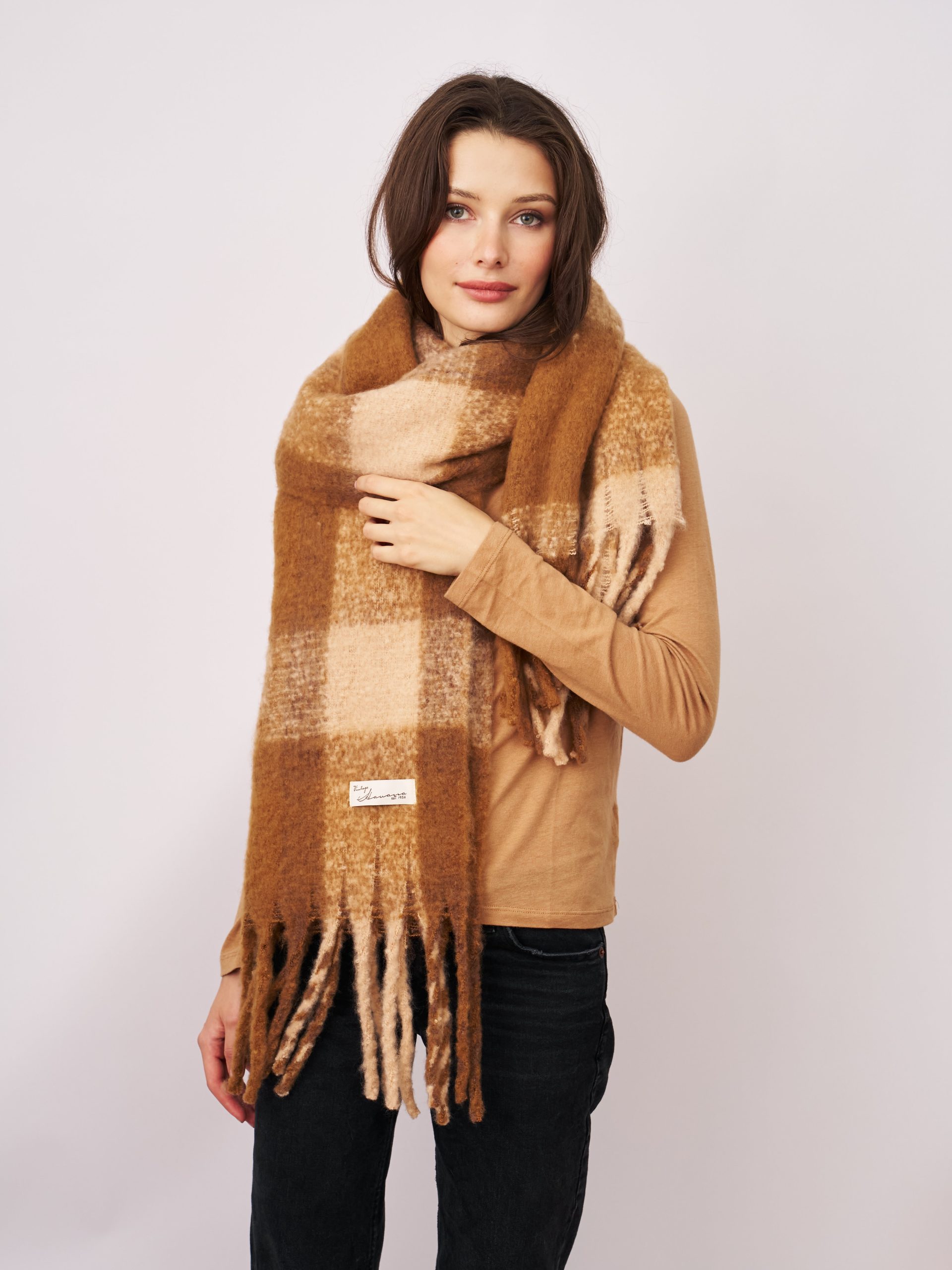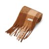 This tan check tassel scarf features a bold brushed fringe design crafted from 100% polyester. Its soft texture and classic pattern make it a versatile accessory that adds warmth and style to any outfit with effortless sophistication.
