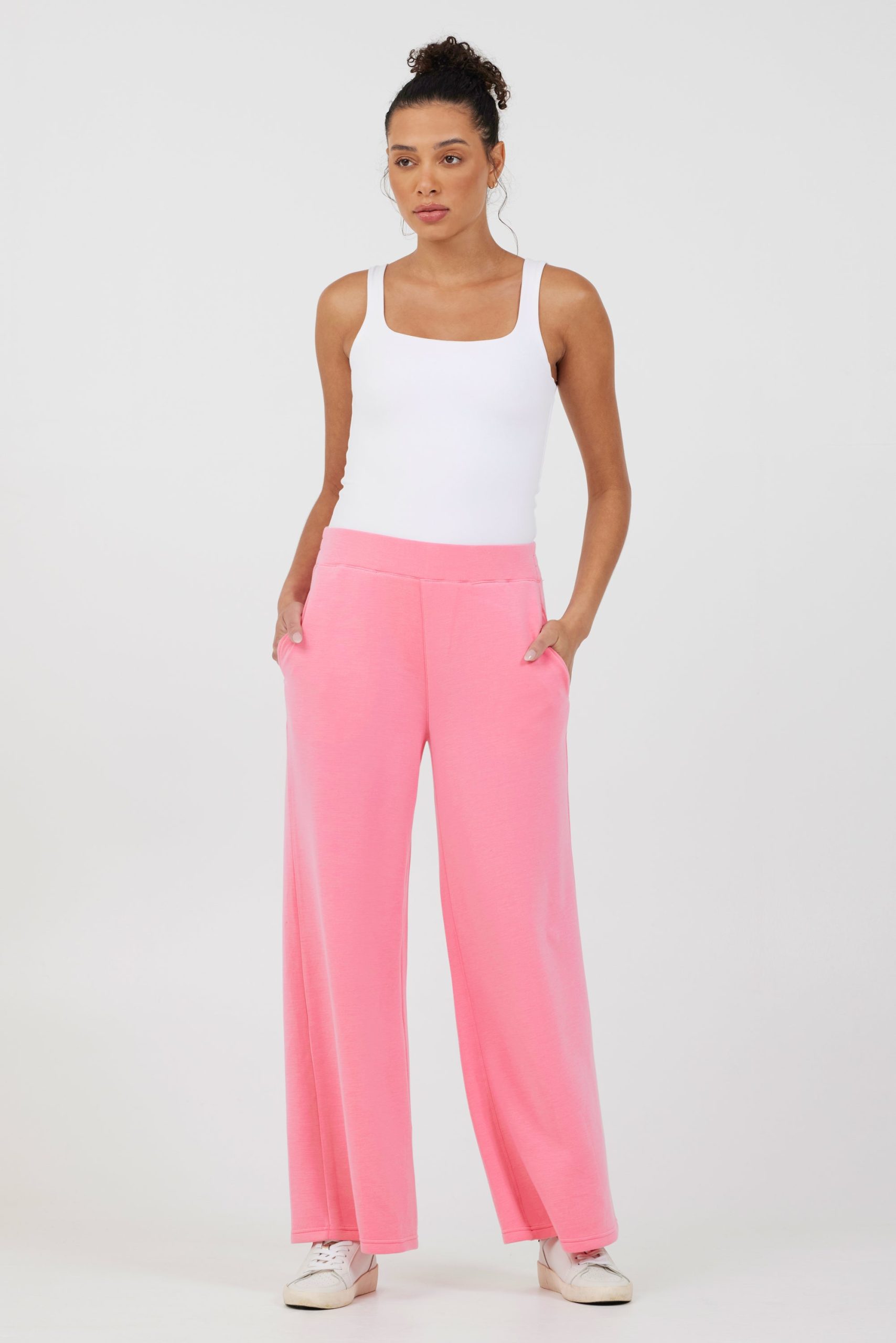 Experience comfort and style with the Coastal Coral Cloud Fleece Flare Pants. Crafted from a soft blend of modal, polyester, and spandex, these pants offer a flattering wide-leg silhouette and an elastic waistband for a perfect fit. Practical front pockets add convenience, making them ideal for both relaxed days and casual outings.
