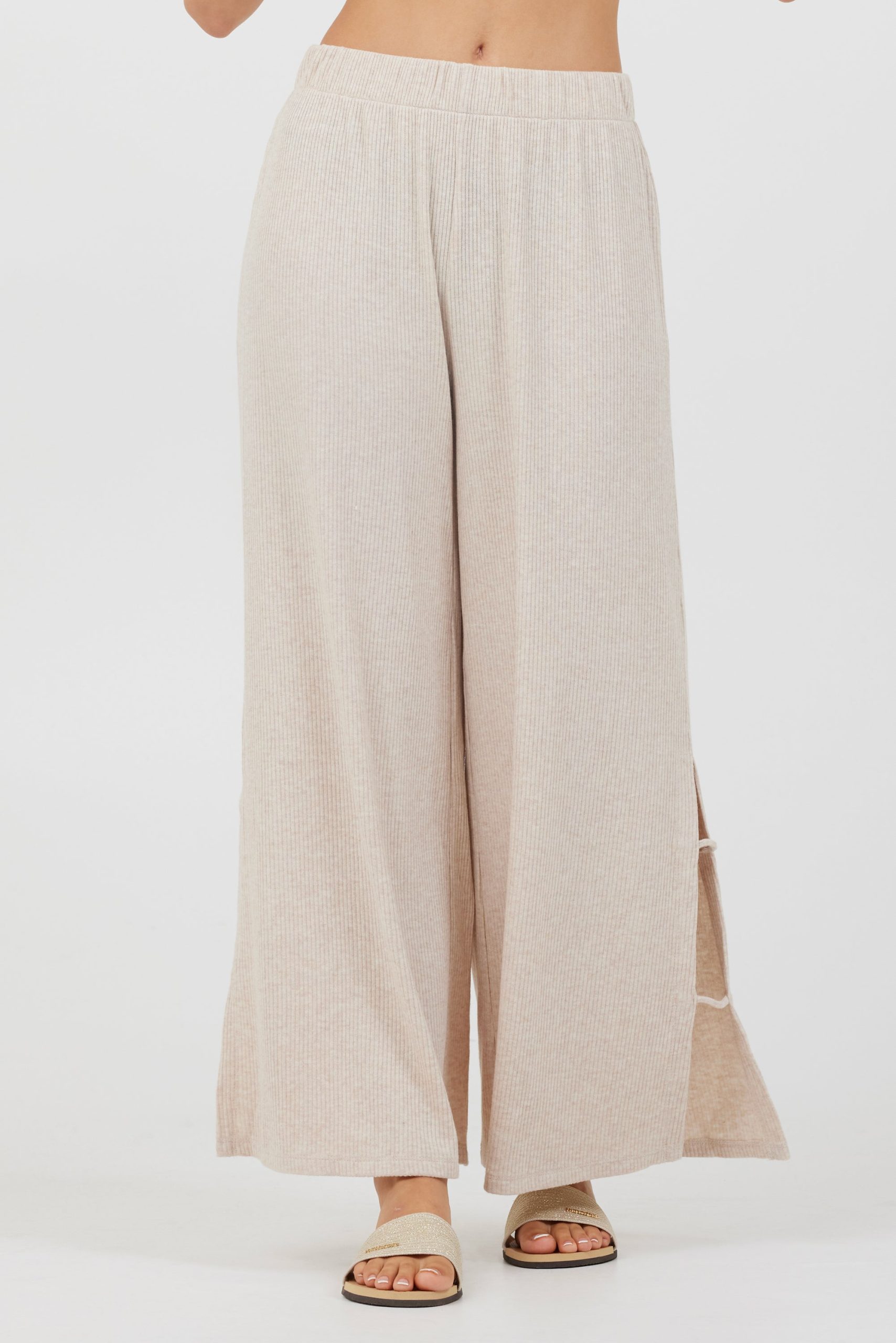 The Heather Oatmeal Drapey Knit Cut Out Pants combine comfort and style with a soft knit fabric and an elastic waistband for a perfect fit. Featuring a modern cut-out detail on the side and a wide-leg silhouette, these pants offer a relaxed yet polished look ideal for casual or refined occasions.