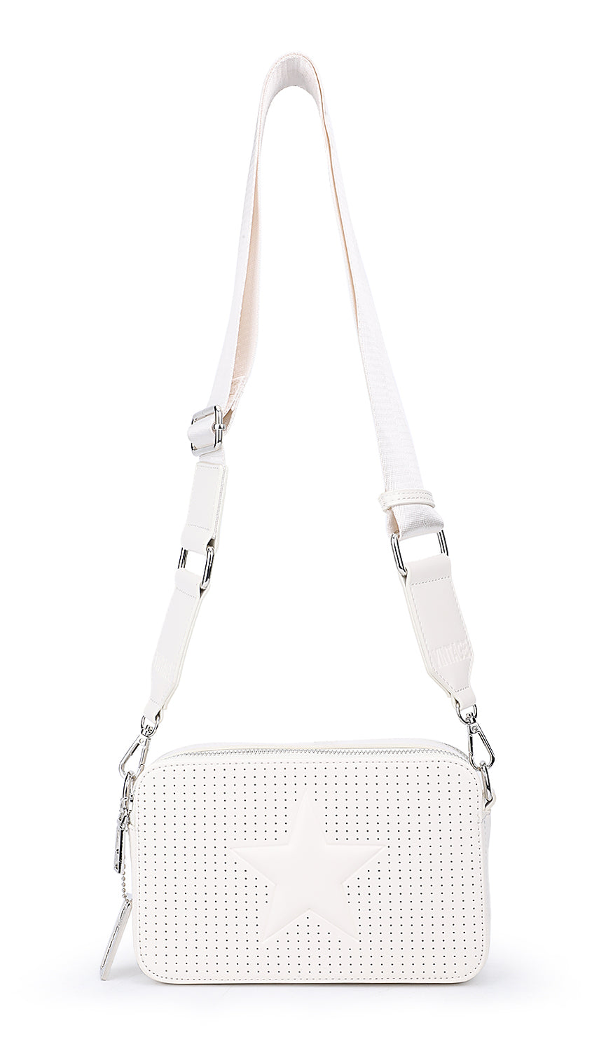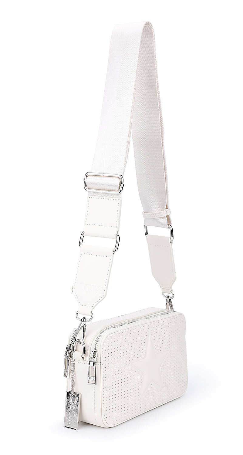 The Henna Bag in white offers a sleek, versatile design with an adjustable crossbody strap for comfortable, customized wear. Its subtle star detail adds a touch of unique charm, making it an ideal accessory for both everyday use and special occasions. Durable and stylish, this bag combines practicality with a refined aesthetic.