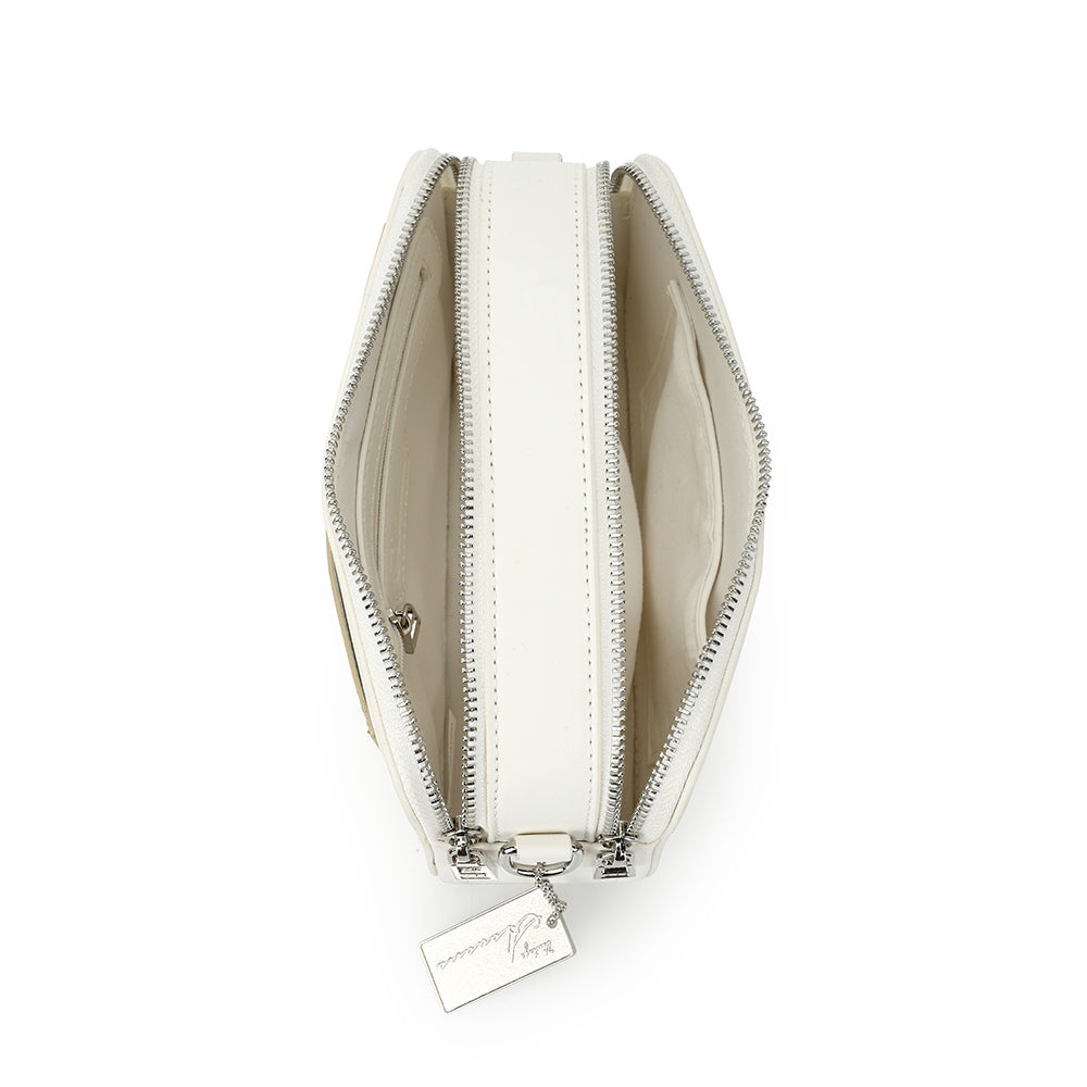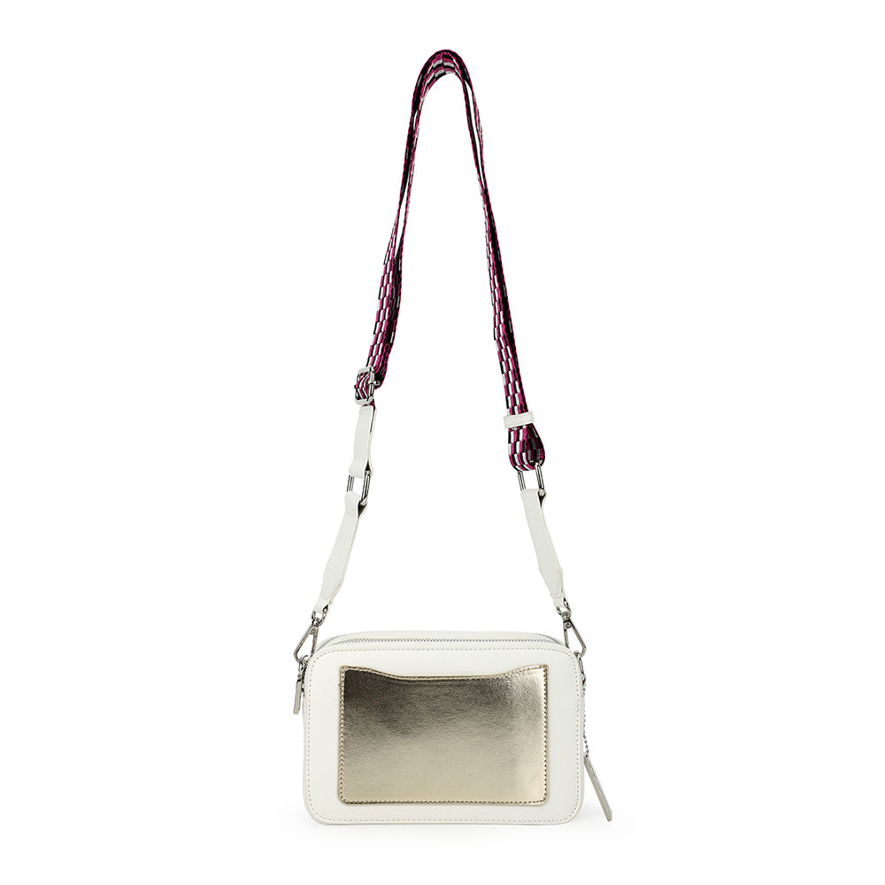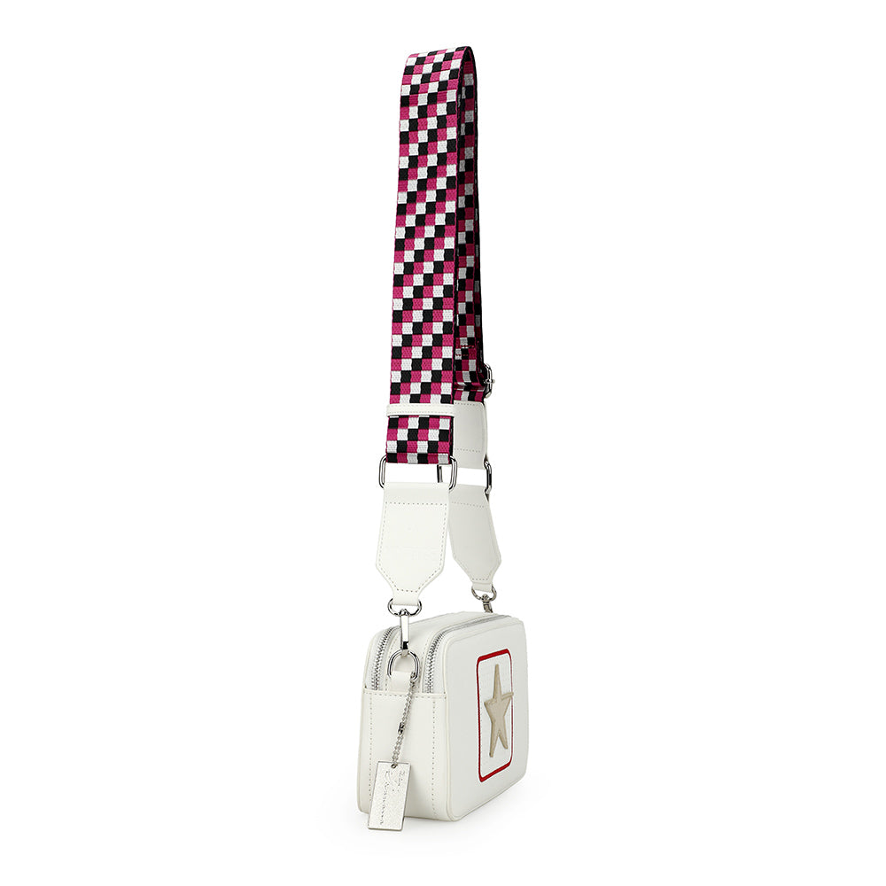 The Legend Bag in white with gold accents combines timeless style with practical design. Featuring a sturdy top handle and an adjustable crossbody strap, it offers versatile carrying options for any occasion. The subtle star detail adds a unique touch, making this bag a standout accessory that effortlessly complements your wardrobe.
