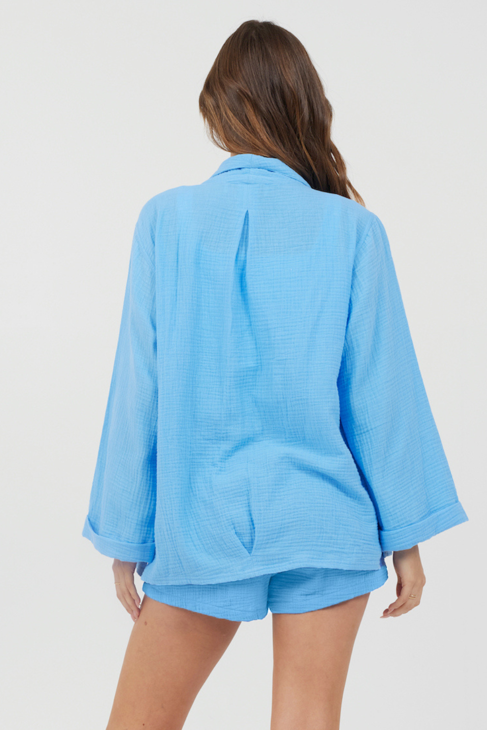 The Ocean Blue Washed Gauze Blazer combines lightweight gauze fabric with a classic button-front design, offering a breathable and comfortable fit. Its washed ocean blue hue adds a relaxed yet refined touch, making it an ideal layering piece for both casual and professional settings. Perfect for those seeking effortless style with a subtle statement.