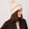 This ribbed pompom beanie in a warm ivory and tan blend features a stylish whipstitch trim for a subtle handcrafted touch. Its soft, stretchy fabric provides comfortable all-day wear while adding a cozy, casual accent to any outfit. Perfect for chilly days, this beanie combines classic design with modern comfort.