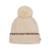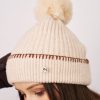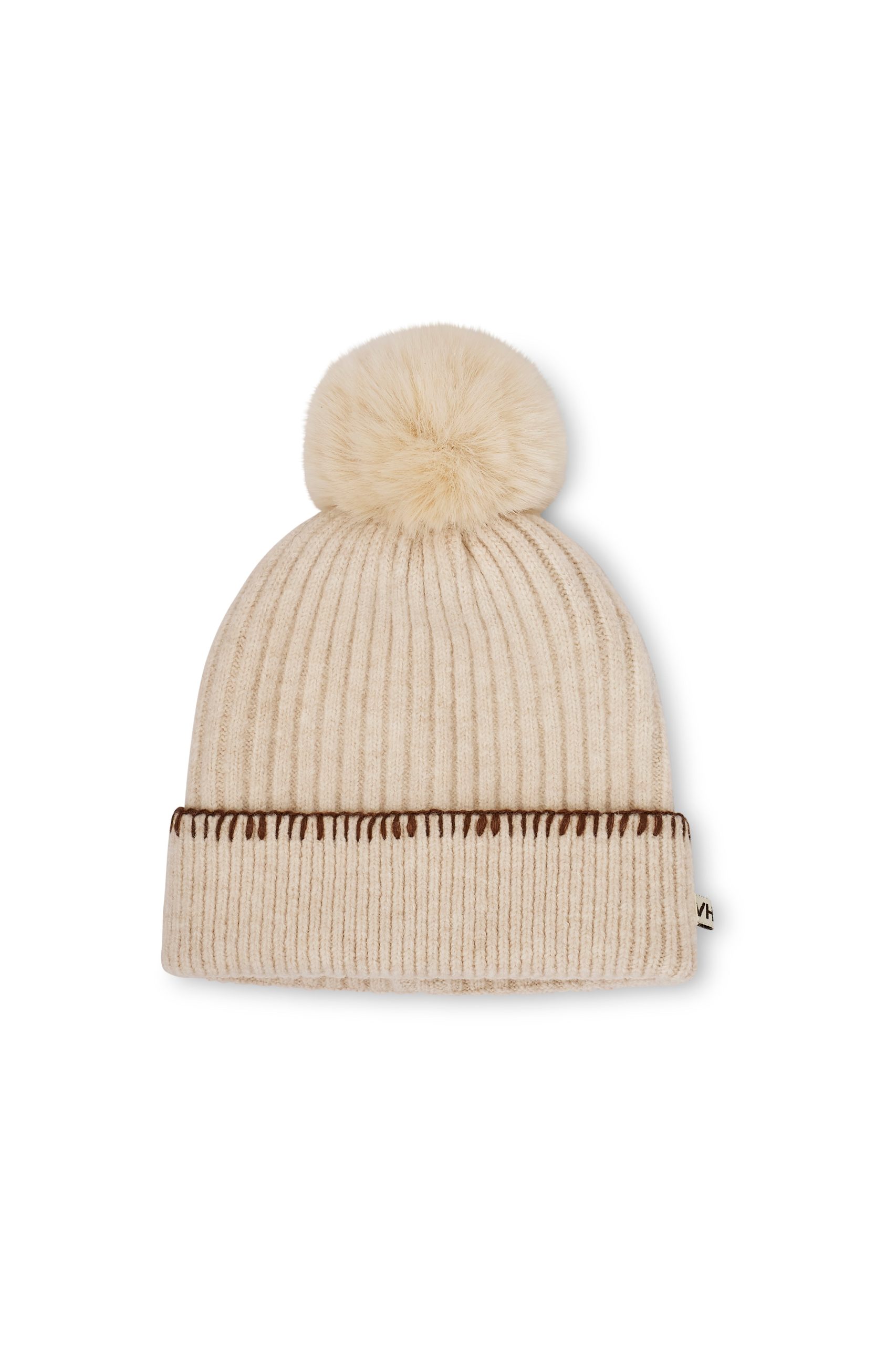 This ribbed pompom beanie in a warm ivory and tan blend features a stylish whipstitch trim for a subtle handcrafted touch. Its soft, stretchy fabric provides comfortable all-day wear while adding a cozy, casual accent to any outfit. Perfect for chilly days, this beanie combines classic design with modern comfort.