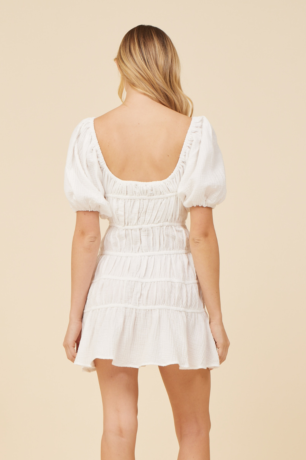 The White Gauze w/ Jersey Combo Dress combines airy comfort with stylish details. Featuring a smocked bodice for a flattering fit, puff sleeves that add a touch of volume, and tiered layers for subtle movement, this dress offers effortless elegance perfect for any occasion. Its lightweight gauze and soft jersey blend ensure all-day comfort without sacrificing style.