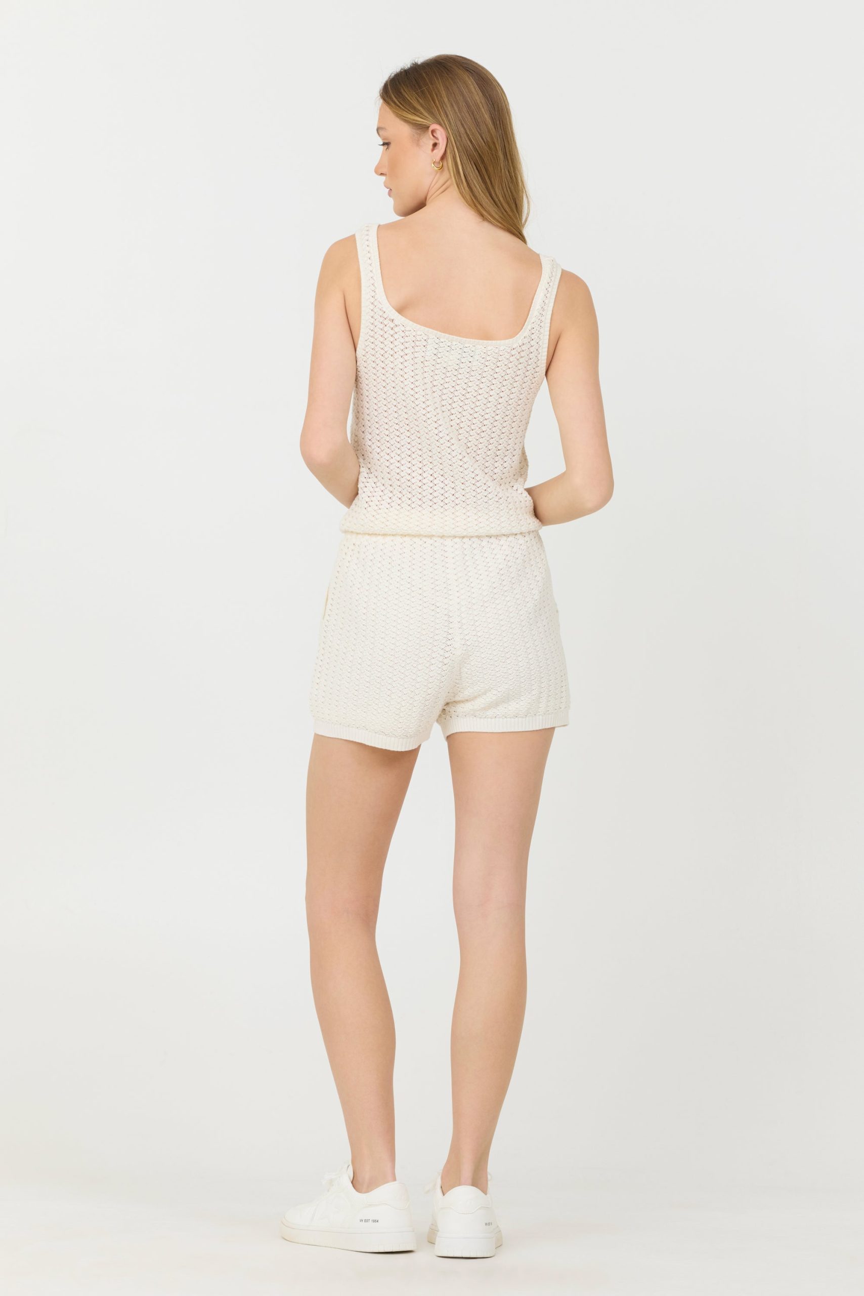 The White Open Crochet Romper features: